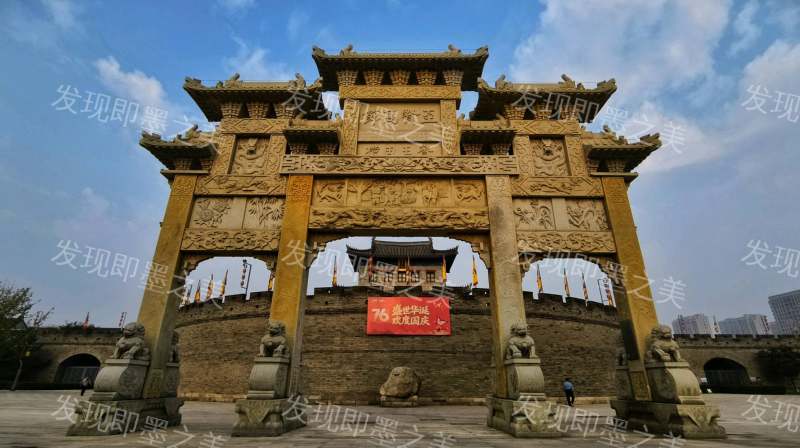即墨古城东门,巍峨的石牌坊下,灰褐色城墙庄重矗立。中央悬挂着红底金字的“76盛世华诞 欢度国庆”标语,数字“76”与祥云图案相映,在蓝天白云下格外醒目。牌坊上“即墨”题字与精雕龙纹诉说古韵,城楼飞檐下黄旗飘扬,传统建筑与红色庆典元素交融,尽显“古城新韵贺华诞”的庄重与喜庆。