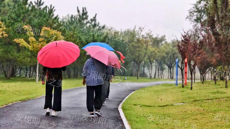 细雨朦胧中的环秀湖公园,宛如一幅淡墨轻染的水墨画。三位行人撑着色彩鲜艳的伞——红、蓝、粉,沿着蜿蜒的步道悠然踱步。雨滴轻敲伞面,似在弹奏一曲悠扬的乐章。四周树木在雨幕中若隐若现,绿意与伞的亮色相互映衬,构成了一幅充满诗意与生活气息的画面。