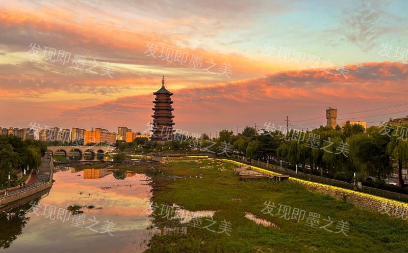 墨水河畔,文峰塔立着。塔身层叠,飞檐在晚霞里亮堂堂。河面像镜子,塔影在水里晃。岸边绿树、石桥衬着,天边晚霞红通通,塔尖直冲云霄,古韵和现代感混在一起,好美。
