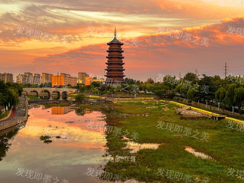 暮色四合,青岛即墨区墨水河畔的文峰塔沐浴在绚烂的晚霞中。橙红与粉紫交织的云霞铺满天际,如绸缎般轻盈舒展,塔尖的鎏金宝顶在余晖下熠熠生辉。