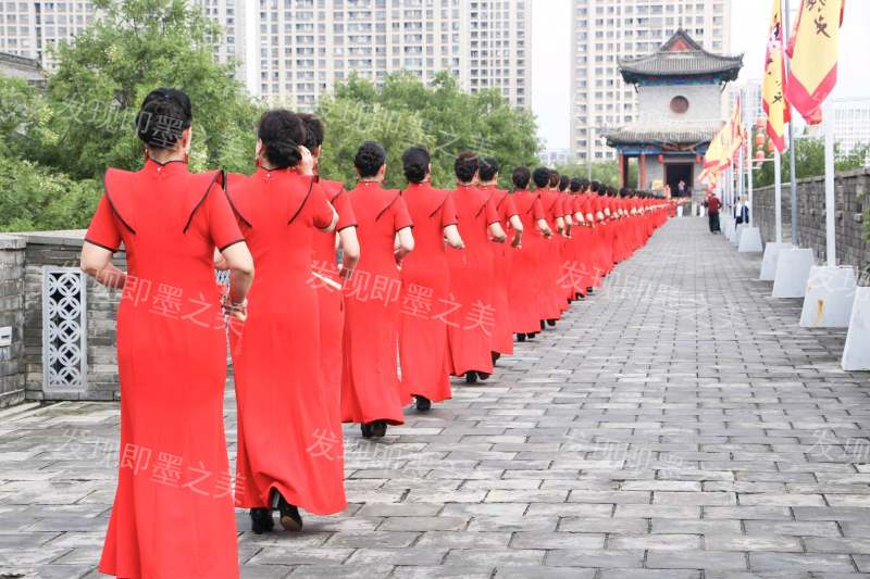 即墨旗袍模特协会的成员身着统一红色旗袍,沿即墨古城墙的青石板路款款而行。队伍整齐划一,背影如红色长龙蜿蜒,传统盘发与旗袍开衩处的优雅步态相映,古城门楼、灰墙黛瓦与飘扬的旗帜作背景,古今交融间尽显东方韵味。
