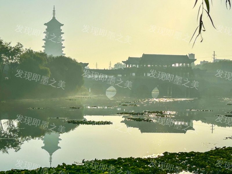 晨光轻洒,水汽如薄纱般在空气里轻漾,为文峰塔、南关街桥与绿树织就朦胧的诗意滤镜。