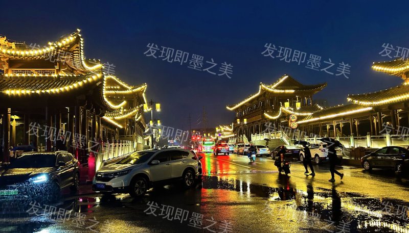 即墨南关街桥的雨夜,古建檐角的暖黄灯光与街面雨影交织,车流、行人与飞檐斗拱相映,传统韵味与烟火气在夜色中交融。