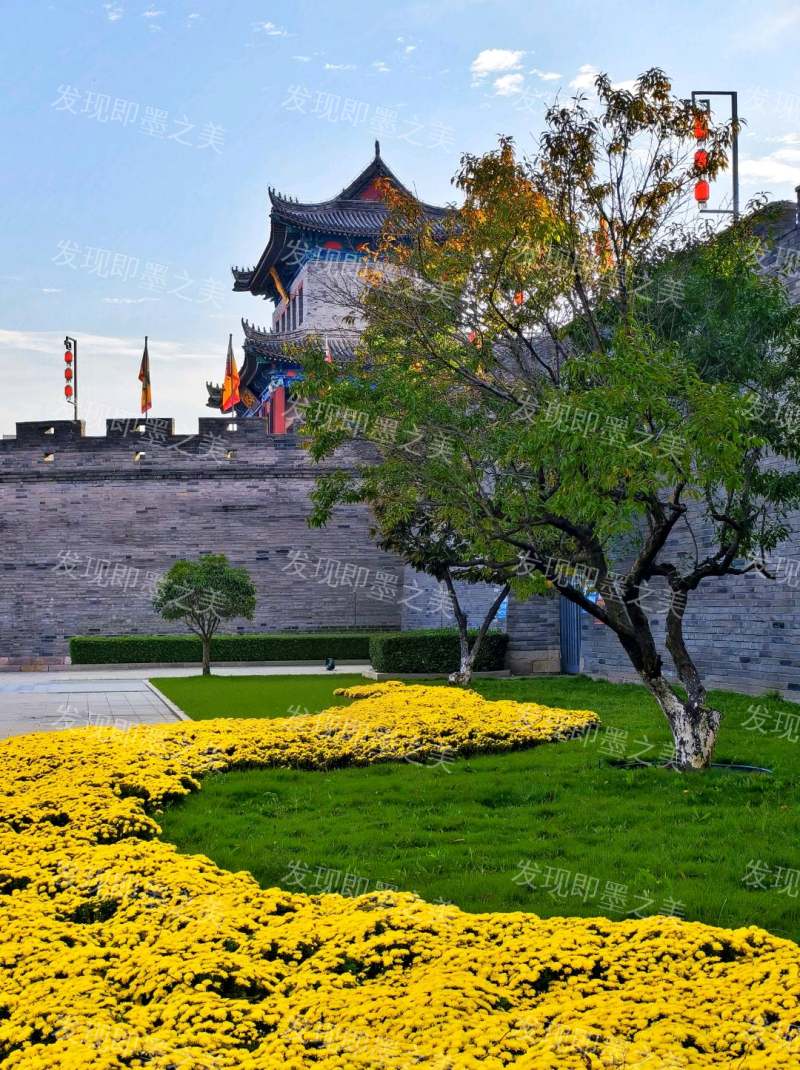 即墨古城东门的秋意浸在明黄与古色之间——千株秋菊铺成金色绒毯,沿阶漫向青砖城墙,花瓣上还凝着晨露的微光。城楼飞檐翘角如振翅欲飞的鸿鹄,黛瓦下彩绘依稀,檐角风铃与红绸灯笼相映,树影斜斜扫过斑驳砖面,将古今时光织进这帧菊香萦绕的城楼画卷里。