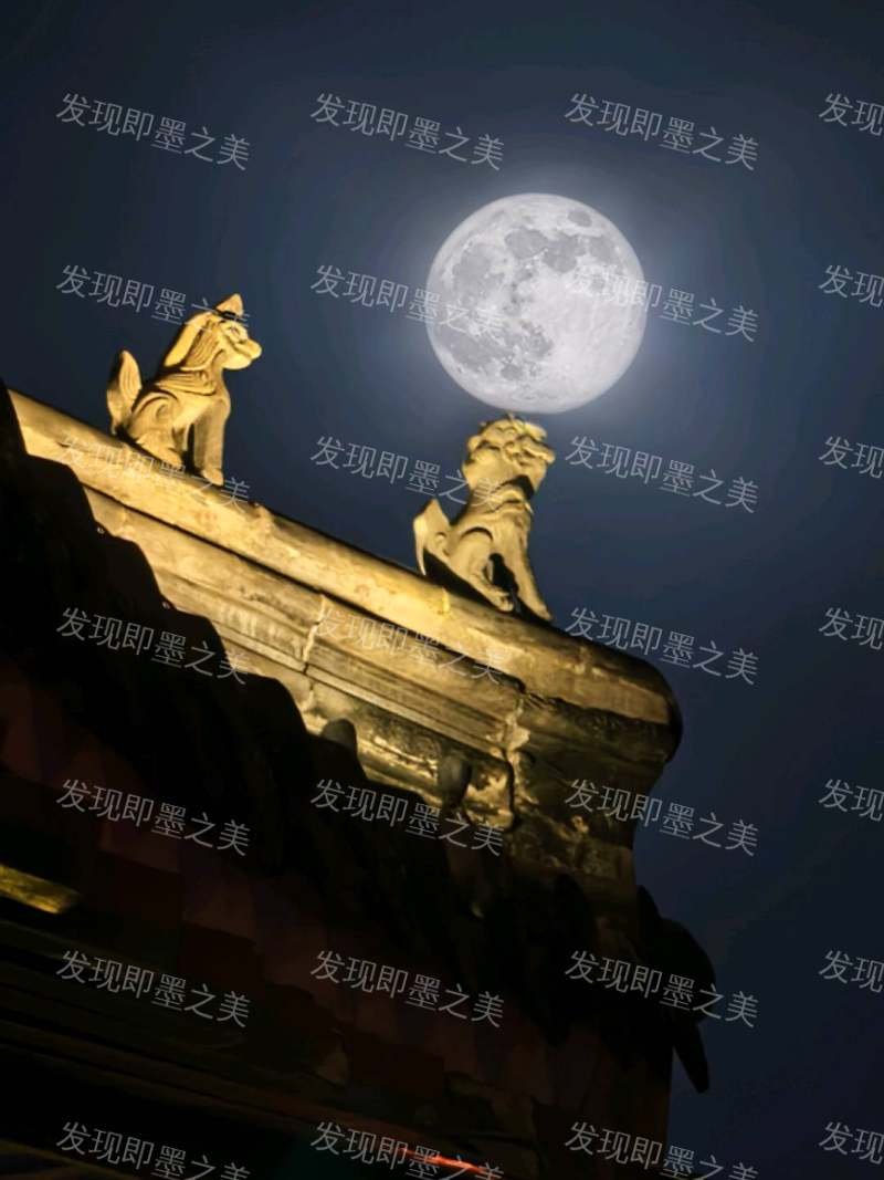 即墨古城的古建筑檐角上,两只神兽石雕在夜色中静静伫立,背后是一轮皎洁的满月高悬夜空,月光与檐角的轮廓勾勒出古朴而静谧的画面。