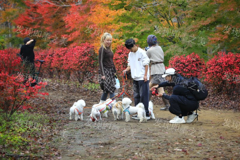 红叶烂漫的林间小道上,几位游人带着一群可爱的小狗嬉戏,红枫与萌宠相映,欢声笑语中洋溢着秋日的温馨与活力。