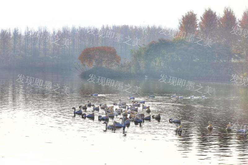 薄雾未散的湖面上,成群的白鹅或游或浮,远处红枫点缀的岸线朦胧如画,晨光洒在水面泛起粼粼波光,充满诗意与生机。