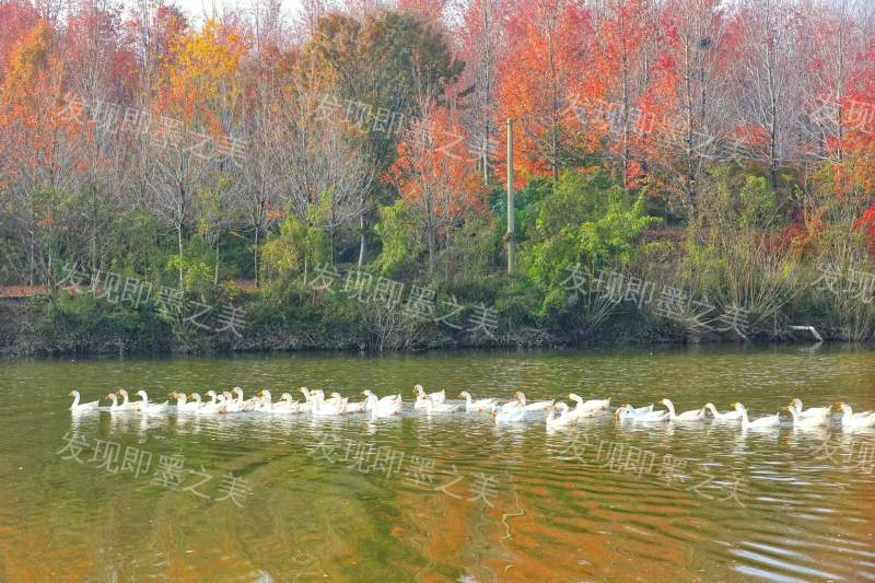 两岸层林尽染,红枫与绿树相映成趣,一群白鹅排成整齐队列游弋湖中,水面倒映着斑斓树影,宛如流动的彩色画卷。