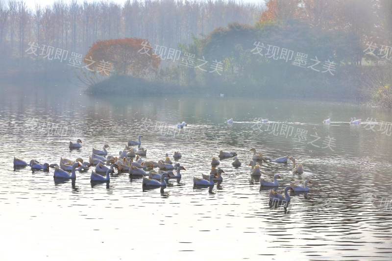 朝阳驱散薄雾,湖面清澈如镜,鹅群在水中形成错落有致的倒影,岸边红枫与远处林带层次分明,展现秋日清晨的宁静之美。