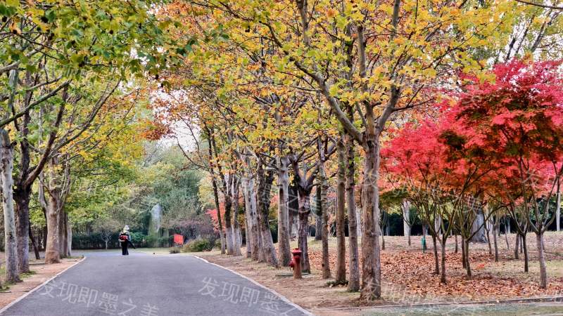 马山公园的秋日光景如打翻的调色盘:金黄的梧桐叶与翠绿的树冠交织成拱廊,右侧一株红枫燃得热烈,落叶铺满地面如金色地毯。小径尽头,有人闲步其间,与静谧的斑斓秋色相映成趣,尽显秋日游园的悠然意境。