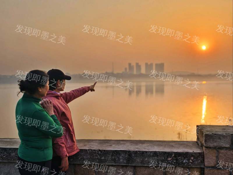 晨雾中的环秀湖水平如镜,朝阳跃出天际,将湖面染成金红,粼粼波光与远处城市剪影相映。两位观景人凭栏远眺,一人抬手指向日出方向,画面静谧中透着对自然的欣然向往。