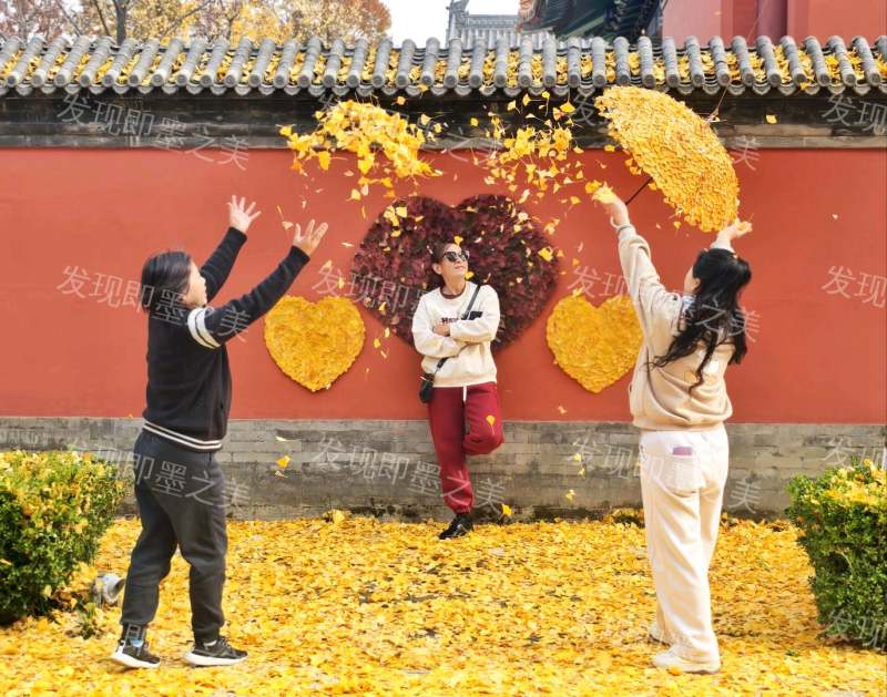 即墨古城红墙下,朱红墙面衬着灰瓦飞檐,墙前铺满金黄银杏叶,心形叶饰点缀其间。游人或抛洒银杏如雨,或举着叶伞嬉戏,红墙映金叶,动静之间皆是深秋的浪漫与古韵。