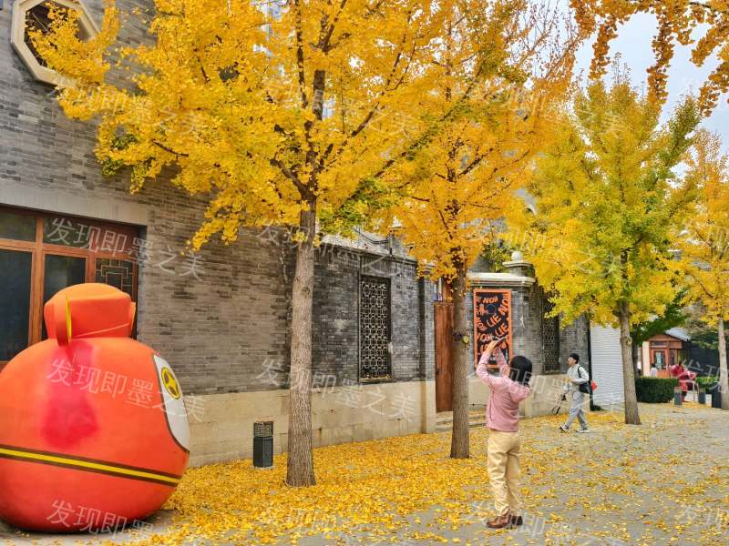古城灰墙黛瓦间,金黄银杏树枝繁叶茂,阳光穿透叶片洒下碎金,地面铺就厚厚一层银杏叶毯。游人或举机定格秋光,或与树下橙红萌趣雕塑合影,古建的沉静与秋叶的绚烂相映,时光在此处慢成一首秋的短诗。