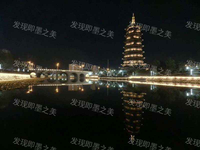 即墨文峰塔夜色中亮灯,塔身暖黄灯光逐层晕染,飞檐斗拱在光影中更显古朴,塔刹鎏金顶璀璨夺目。近旁石桥与河岸灯带相映,塔影完整倒映水面,与实景形成对称画卷,静谧中透着庄重典雅。