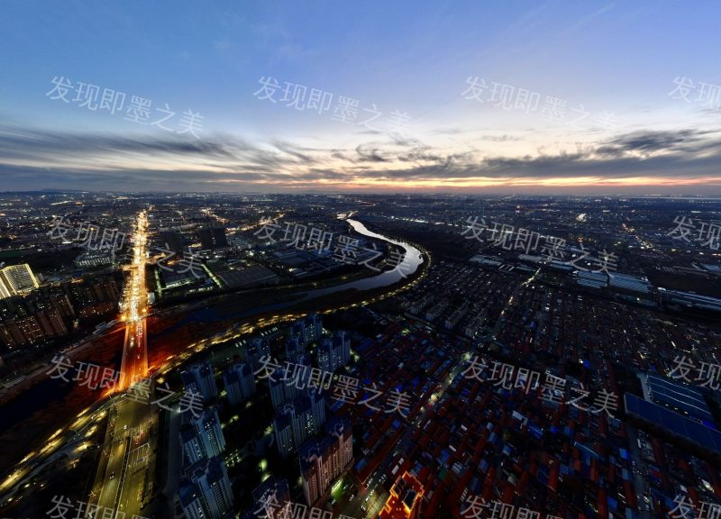 蓝调时分,航拍视角下的墨水河绕沟岔村蜿蜒流淌,暖灯勾勒出村舍肌理,主干道金光如带,村庄灯火与河湾相映成辉。