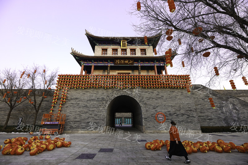 2021年1月2日古城在筹备迎接央视“2021东西南北贺新春”青岛即墨会场拍摄。镜框内那些挂在墙上、垂在树上和散放在地上的灯笼非常协调的成为一体,仿佛呈现着工人们张灯挂彩的忙碌场面,也初现了重大文化活动和春节佳节的喜庆;地上的灯笼引发看图人的联想,这些挂起来会是何等的壮观好看啊;城门口右侧墙壁上的“学习强国”标志激励着人们在历史传承中放飞梦想;图中人物被广角镜头夸张出了匆忙形象,与场面气氛迎合。整个图片干净、利落,没有多余的东西。
