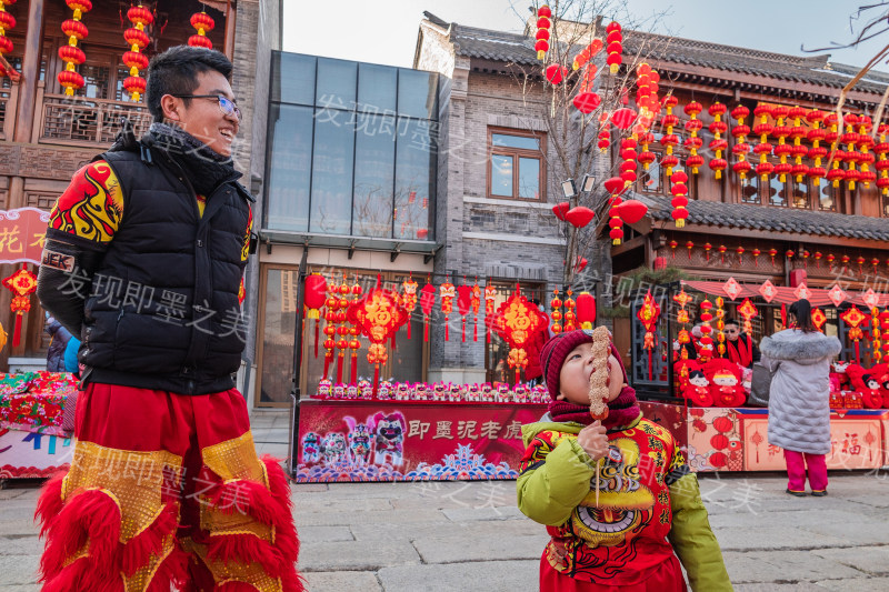 古城,舞狮特技队的一对儿父子,彩排结束游古城。