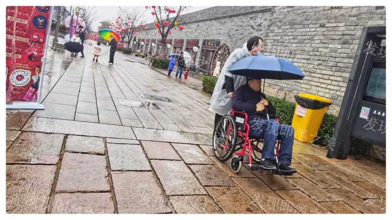2021年2月14日上午,小雨淅沥沥,一位推着老人的轮椅出现在古城南门,画面感人。