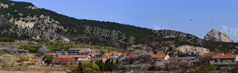 鳌山卫街道垛石村的初春,樱桃花开放,一行白鹭飞过村庄上空。