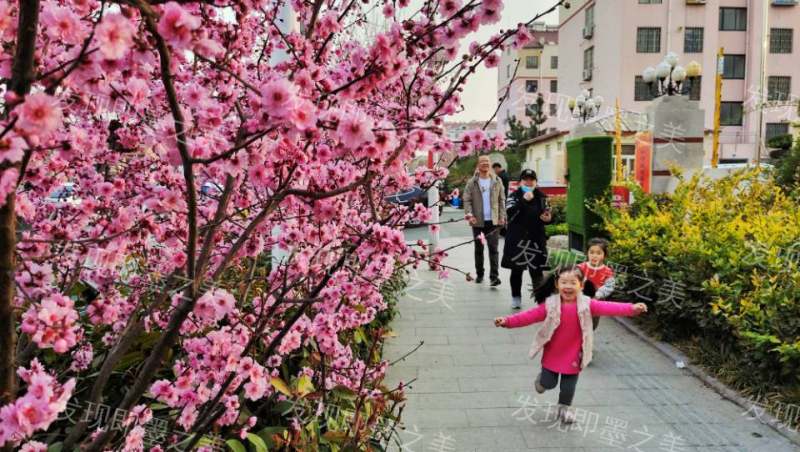 春暖花开,小区门口的道路上,花开正红,孩子们兴高采烈地跟着大人出门赏花。