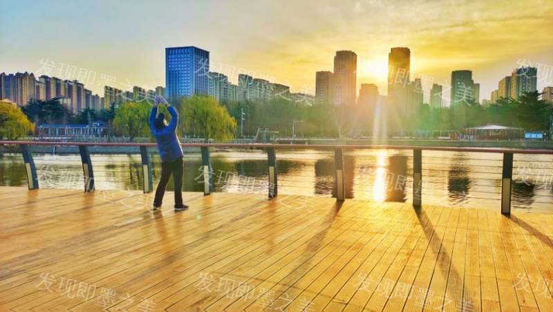 阳春三月的墨城朝霞映照着墨河水面,也映照着晨练的市民。