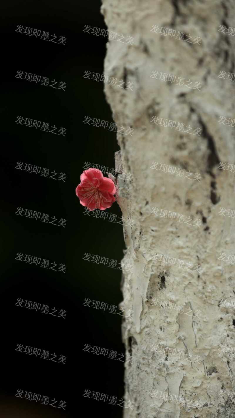 开在树干上的梅花,刷了石灰粉的树干和黑色的背景相应成趣