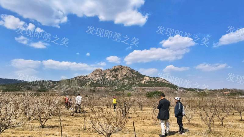 照片展现了姚家庄田园的晴日景象:湛蓝天空点缀白云,远处青山绵延,山间点缀着绿植与零星建筑。近处田野中,人们三五成群——有人弯腰专注挖掘野菜,动作轻巧,静谧的山野共同构成和谐画卷。