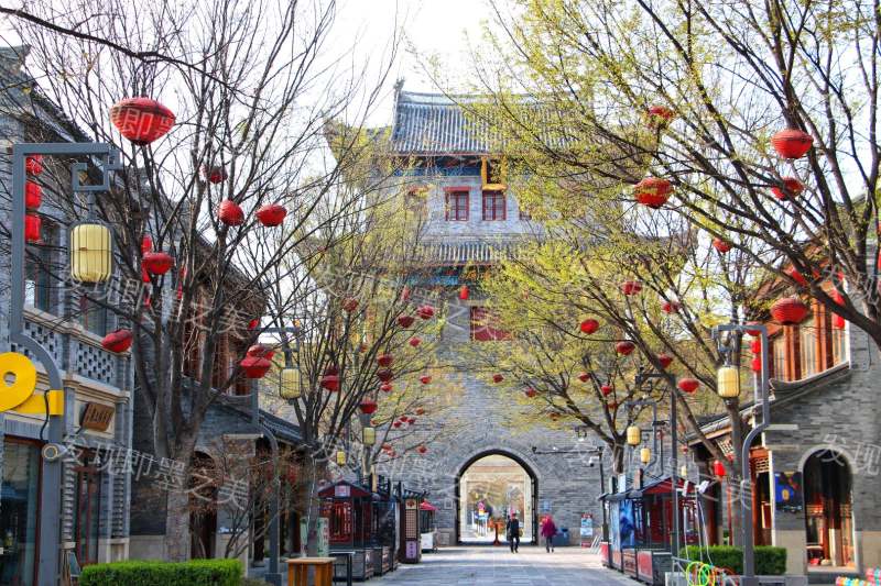即墨古城南城门巍然矗立,城楼顶部为传统中式飞檐翘角,朱红色的梁柱与青灰色砖瓦相映成趣。街道两侧的树木缀满红灯笼,古建筑群沿街延伸,石板路上行人往来,透出浓郁的节庆气息与历史韵味。