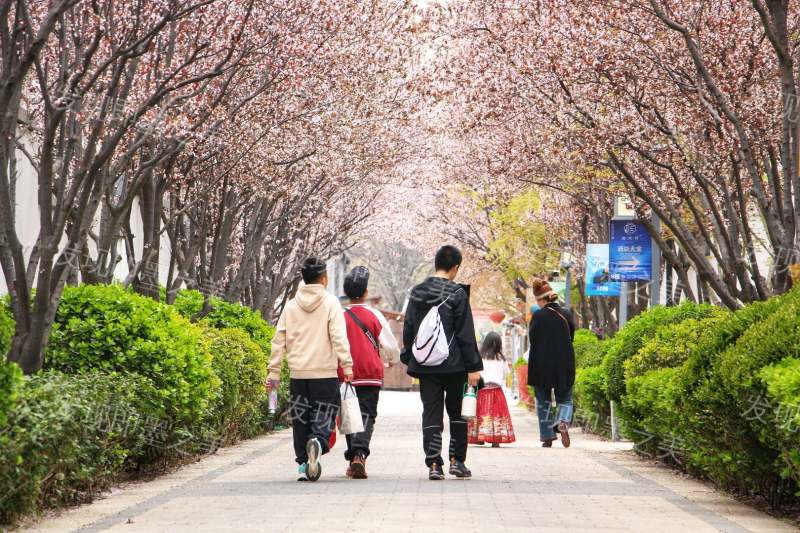 即墨古城的小巷中,两排红叶李树缀满粉嫩花朵,枝头交织成春日花廊。三两游人漫步青石小径,衣角轻拂过灌木丛的新绿,远处翘角屋檐在花影间若隐若现。