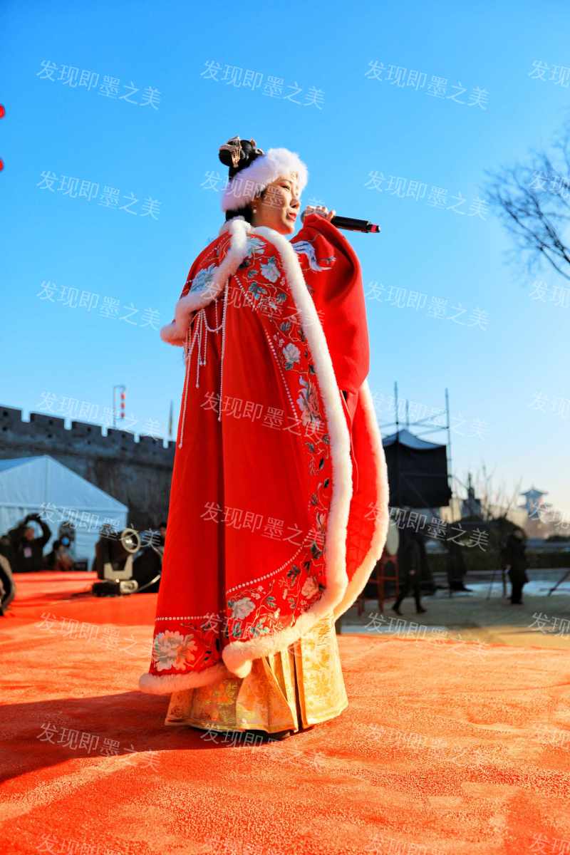 墨城文化节开幕式上的演员,身着古装。背对古城。看起来就像穿越到古代一样