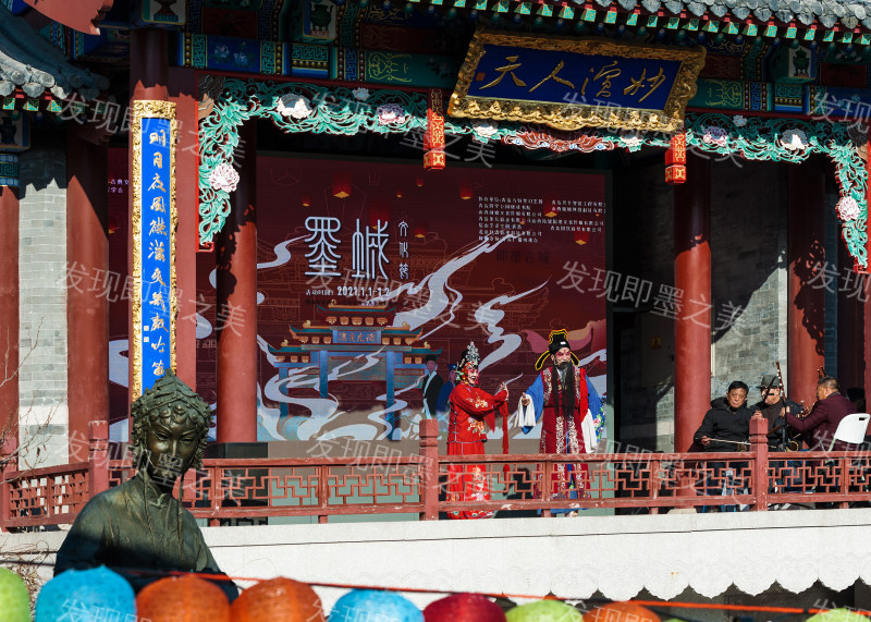 当时的想法是:前景,戏台前方旁边古装女艺人;主体,正在唱柳腔的二位演员。二者能否起到,暗示即墨柳腔这个具有几百年历史的地方曲目的历史传承。