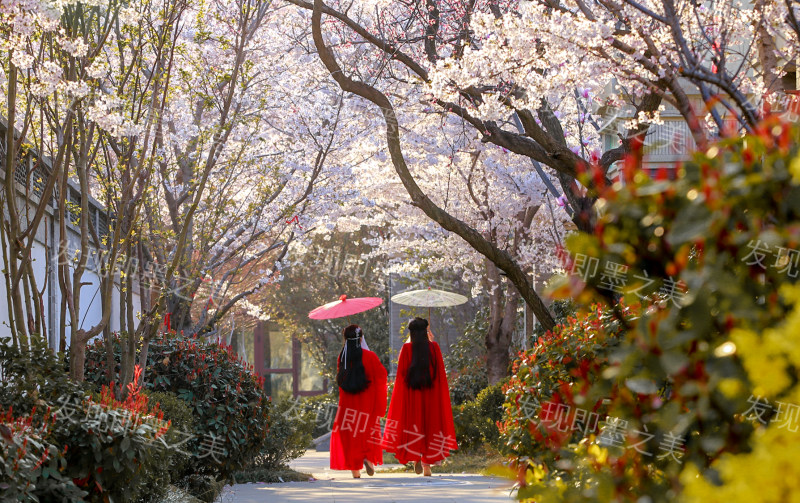 即墨古城春暖花开之时,引得游客扮若花仙子翩翩而来游玩赏花。
